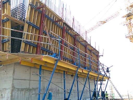 The formwork is firmly connected to the scaffolding and moved as a crane unit. It can also be used as a working scaffold only. The working platform consists of planking, platform beams, and two fixed climbing brackets.